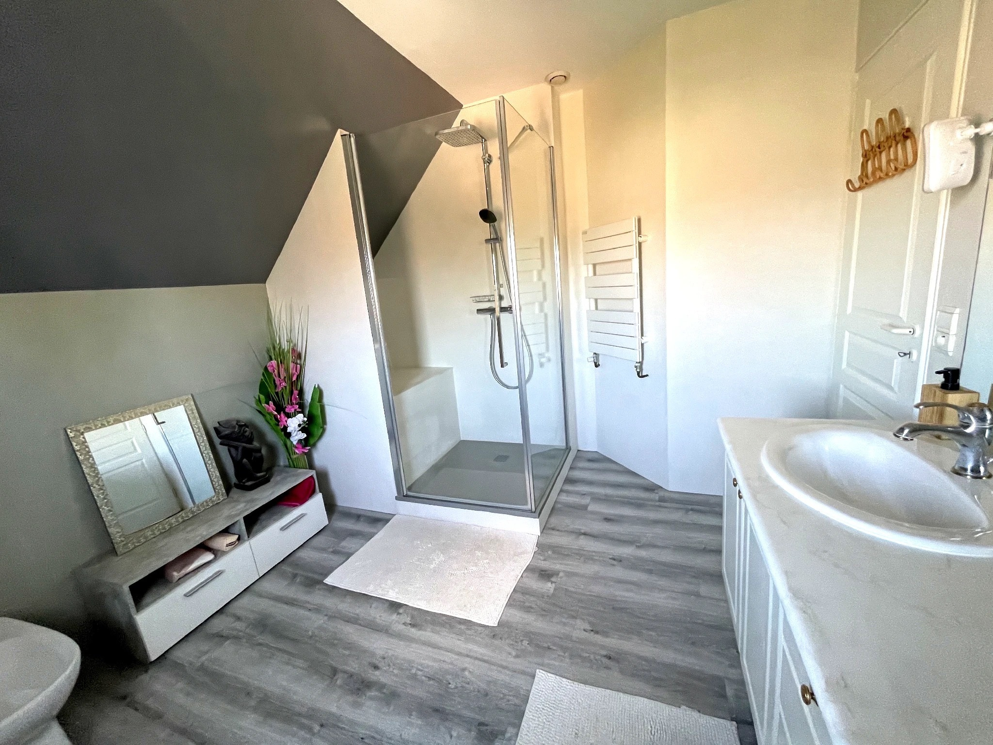 Vous bénéficierez également de tout le confort moderne avec de nombreux rangements, d'un chauffage au gaz grâce à une chaudière Viessmann récente, de volets électriques et d'un grand store banne.